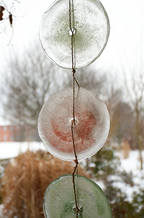 Besonders schön finde ich Scheiben aus Eis, die man entweder mit gefärbten Wasser gießt oder in die man Pflanzenteile wie Farne einfriert. Beim Farn geht man in zwei Etappen vor: Man füllt ein Teller (oder besser eine Plastikform, die kriegt man nachher schneller gewärmt, damit das Eis rausfällt) zur Hälfte mit Wasser und legt den Farn hinein. Dieser schwimmt an der Oberfläche und man wartet, bis die Fläche Eis ihn festgefroren hat. Nach einiger Zeit gießt man die zweite Hälfte mit Wasser auf und wartet möglichst geduldig, bis alles durchgefroren ist. Die Löcher habe ich mit einem Eisenspieß, den ich im Kachelofen in der Glut gewärmt habe, eingeschmolzen.